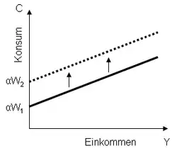 mit der marginalen Konsumneigung aus Vermögen α und der marginalen Konsumneigung aus Einkommen β.[15]