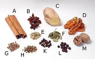 Lebkuchengewürze: A Zimt, B Sternanis, C Ingwer, D Macis, E Fenchel, F Kardamom, G Koriander, H Anis, K Gewürznelken, L Piment, M Muskatnuss