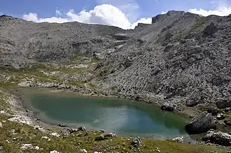| Der Lech de Crespëina auf der Gardenacia-Hochfläche mit der Ciampacspitze im Hintergrund. | ||