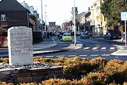 Westlich der heutigen Altstadt bestand in römischer Zeit an der Straße nach Aachen, die an der Erft von der Straße Römerstraße Trier–Köln, heute Agrippa-Straße Köln–Trier abzweigte, eine kleine Siedlung (Vicus). Teile der Anlage wurden 1972 bei Ausschachtungsarbeiten entdeckt. Auf einer „Trümmerstelle“ in der Flur „Am Böttchen“ wurden auf einem Areal von 180 × 200 Meter sechs Baugruben freigelegt, von denen drei eine Häuserzeile bildeten. Drei weitere Häuser begrenzten das Rechteck. In den römischen Fundamenten, einer Brandschicht und Abfallgruben kam Keramik zu Tage, die ins 2. bis 4. Jahrhundert datiert wurde. Des Weiteren haben die beiden Ubier „Ialehenius“ und „Challinius“ den Matronae Lanehiae auf deren Befehl (ex imperio ipsarum) einen Weihestein errichtet,[6] deren Name sich im heutigen Ortsnamen Lechenich fortsetzt. Der um das 2. Jahrhundert datierte Votivstein mit einer Offenbarungs-Inschrift befindet sich heute ebenfalls im Rheinischen Landesmuseum in Bonn.[7] Ein kleinerer Stein dieser Epoche blieb der Stadt jedoch vor Ort erhalten, er befindet sich sichtbar im äußeren Mauerwerk der Kapelle Heddinghoven. Am Rande der Siedlung lag ein Tempelbezirk von etwa 50 m × 90 m Ausdehnung. Gefundene Reste von Sandsteinkapitellen und Säulen, Fragmente von mehreren Altären, zahlreiche Keramikreste und ein vollständig erhaltener Sandsteinapfel verweisen auf ein Matronenheiligtum.[8]