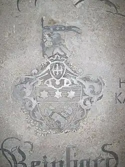 In einem goldenen Feld zwei ins Kreuz gelegte, mit den Füßen nach unten und einwärts, mit den umgebogenen Schenkeln nach oben und einwärts gekehrte Beinschienen[5] natürlicher Farbe unter einem blauen Schildhaupt, in dem drei goldene Sterne nebeneinander zu sehen sind. Auf dem gekrönten Helm ein nach rechts und vorwärtsgekehrter geharnischter Mann, der in der rechten Hand ein zweispitziges blaues mit drei goldenen Sternen belegtes Fähnlein hält und den linken Arm in die Seite stützt. Die Helmdecken sind rechts gold und blau, links gold und schwarz.[6]