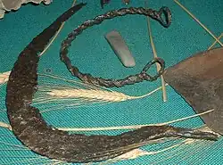 Eisen-Legierungen wurden bereits in prähistorischer Zeit verwendet, allerdings nur aus Meteoriten, in denen sich häufig die Legierung Eisen-Nickel (FeNi) befindet. Da Meteoriten selten gefunden wurden, waren Gegenstände aus Eisen entsprechend wertvoll. Die Sumerer nannten es „Himmelsmetall“, die alten Ägypter „schwarzes Kupfer vom Himmel“.[7] Verhüttetes Eisen (Erkennung durch Fehlen von Nickel) wurde in Mesopotamien, Anatolien und Ägypten gefunden und ist etwa 3000 bis 2000 v. Chr. entstanden. Es war wertvoller als Gold und wurde vor allem für zeremonielle Zwecke verwendet. Eisen ist härter als Bronze und Kupfer, was in vielen Anwendungsfällen wichtig war und ist. Verbesserungen in der Eisengewinnung und -verarbeitung ließen die Menschen dazu übergehen, Waffen und Werkzeuge wie Pflüge aus Eisen zu fertigen (siehe auch Geschichte der Produktionstechnik). Die Bronzezeit ging zu Ende und die Eisenzeit begann.