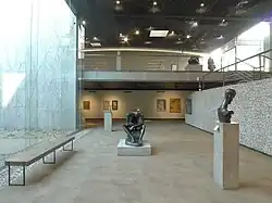 Auch der Lehmbruck-Trakt entstand 1964. Für diesen Teil des Baus auf der linken Seite der Kassenhalle entwarf Manfred Lehmbruck für das skulpturale und malerische Lebenswerk seines Vaters einen Stahlbetonbau, der sich auf mehreren Galerieebenen mit langen Treppenläufen tief in die Erde eingräbt. „Um ein offenes zentrales Atrium, das als strenges Quadrat gestaltet ist, werden die Binnenräume an der Nord- und Südseite von jeweils zwei gegeneinander versetzten und gewölbten Betonschalen begrenzt.“[6]