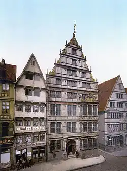 Die am Holzmarkt in den Jahren 1981 bis 1983 nachgebildete Renaissance-Fassade des Architekten Wilfried Ziegemeier mit Bildwerken von Georg Arfmann verfügt am Erker über einen reichen Bildschmuck. Dargestellt werden eine Reihe biblischer Motive: die Erschaffung Evas, Adam und Eva unterm Baum (samt Wachhund), die Vertreibung aus dem Paradies, Kain und Abel, Isaaks Opferung, Jakobs Traum, Venus und Amor, Christus in Getsemani, Judith mit dem Haupt des Holofernes, das Urteil Salomos, Simson und der Löwe, David und Goliath.