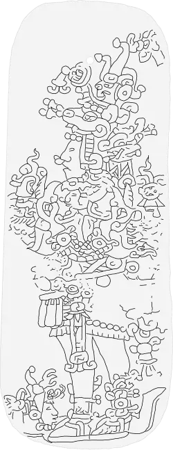 Leidener Plakette – Umzeichnung der Vorderseite mit der Darstellung eines Herrschers aus Tikal (etwa Originalgröße)