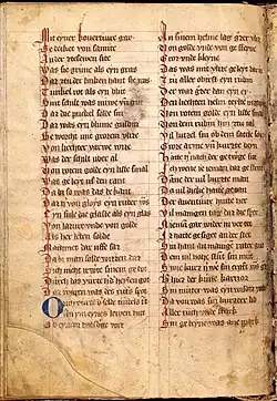 Der Text besteht überwiegend aus einer gotischen Minuskelschrift und ist in Versen abgesetzt. Der Versbeginn wird mit einer rubrizierten Majuskel ausgezeichnet, ein neuer Textabschnitt durch eine zweizeilige rote oder blaue Lombarden.