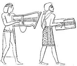 Im Alten Ägypten waren die Sänger mehr geschätzt als die Instrumentalisten, und bei der kultischen Musik stand der Gesang im Mittelpunkt. Nur die Flöten, weil sie wie die Stimme unmittelbar vom lebendigen menschlichen Atem angeregt werden, besaßen eine ähnliche Bedeutung. Die namentlich bekannten Harfner waren wohl in erster Linie Sänger, die sich auf der Harfe begleiteten. Als einzige Leierspielerin ist eine „Tasa“ aus der 25. Dynastie überliefert. Neben ihrer Mumie wurde eine Leier gefunden, sie dürfte dennoch mehr als Sängerin und Tänzerin gewirkt haben. Die Musikinstrumente produzierten vermutlich wenig mehr als einen, im Fall von Blasinstrumenten lang gehaltenen oder bei Saiteninstrumenten mehrstimmig gezupften Bordunton zur Gesangsbegleitung.[23] An die mesopotamische Herkunft der ägyptischen Leiern gab es offensichtlich sogar noch in der Ptolemäerzeit (4.–1. Jahrhundert v. Chr.) eine lebendige Erinnerung, die sich in Stierkopfdekorationen an mehreren Leiertypen ausdrückte.[24]