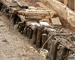 Unter den Kellern des 16. Jahrhunderts stießen die Archäologen in 5 Meter Tiefe auf eine Reihe von metertief in den Uferschlamm gerammten Eichenpfählen, die als Fundament der Ufermauer dienten. Darunter befand sich eine erste Faschinenbefestigung des Leineufers, die aus Staken mit Flechtwerk bestand. Die Holzteile haben sich durch die Feuchtkonservierung am Fluss erhalten. Weitere Fundstücke in den tieferen Erdschichten ließen auf drei Handwerksbetriebe aus der Zeit des 14. Jahrhunderts schließen. Ihre Gewerbe waren Metallverarbeitung, Schusterei und Ledermacherei sowie Hornschnitzerei.[12] Davon hat sich im Grundwasserbereich Fundmaterial aus organischen Stoffe, wie Leder und Textilien, erhalten.[13] Historisch überliefert in diesem Bereich ist eine Lederwerkstatt aus der Zeit um 1400.