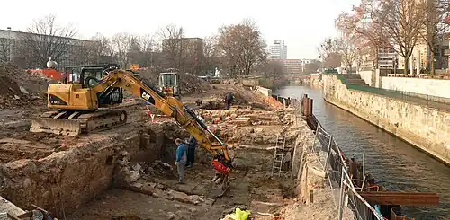 Die baufällig gewordenen Ufermauern der Leine waren einst die Kelleraußenwände von Häusern auf der früheren Leineinsel, die vermutlich in der zweiten Hälfte des 17. Jahrhunderts entstanden sind.[8] Nach Zerstörung des Gebäudebestandes durch die Luftangriffe auf Hannover im Zweiten Weltkrieg wurden in der Nachkriegszeit die letzten Reste eingeebnet und die Keller mit Bauschutt verfüllt. Darüber entstand ein Parkplatz. Vor der Umgestaltung der Ufermauern fanden wegen der geschichtlichen Bedeutung der Stelle von Anfang 2014 bis Anfang 2015 baubegleitend stadtarchäologische Untersuchungen und Ausgrabungen in einem etwa 65 × 12 Meter großen Bereich statt. Sie wurden von einem Grabungsunternehmen im Zusammenwirken mit der Denkmalbehörde der Stadt Hannover und dem Niedersächsischen Landesamt für Denkmalpflege vorgenommen. Bei den Ausgrabungen, die bis in eine Tiefe von 6,5 Metern gingen, wurden die verschütteten Keller freigelegt und denkmalfachlich dokumentiert.[9]