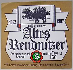 Durch Luftangriffe während des Zweiten Weltkriegs wurde mehr als die Hälfte der Brauereigebäude zerstört. 1946 erfolgte die Verstaatlichung des Unternehmens, das fortan als VEB Riebeck-Brauerei, später als VEB Landes-Brauerei firmierte. Zugleich begann der schrittweise Wiederaufbau der Brauereianlagen. 1959 wurde die Brauerei mit anderen Brauereien, unter anderem mit der ehemaligen Aktienbierbrauerei Gohlis und der als VEB Westquell firmierenden ehemaligen Brauerei C. W. Naumann in Plagwitz,[2] zum Kombinat VEB Sachsenbräu zusammengeschlossen. Im Jahr 1968 folgte die Bildung des VEB Getränkekombinat Leipzig, dessen Stammbetrieb der VEB Sachsenbräu war.
