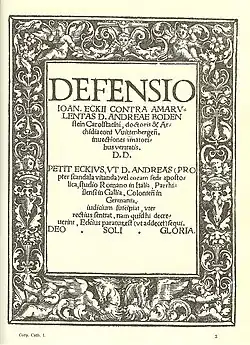 Eck antwortete Luther Ende Mai brieflich, noch in Unkenntnis von Karlstadts Publikation:[23] Er berief sich auf die frühere Freundschaft, die Obelisci seien den Wittenbergern durch eine Indiskretion bekannt geworden, und ihm liege nichts an einem Streit. Auch Luther schrieb noch einmal deeskalierend an Eck, doch Karlstadts Disputationsvorhaben hatte nun durch die in Hunderten von Exemplaren verbreiteten Apologeticae conclusiones eine Eigendynamik gewonnen – Eck musste reagieren. Er tat das mit seiner Verteidigungsschrift, die am 14. August 1518 im Druck erschien. Sie war betitelt als „Verteidigung gegen die bitteren Angriffe des Dr. Andreas Bodenstein aus Karlstadt“ (Defensio contra amarulentas D. Andreae Bodenstein Carolstatini invectiones). Auf dem Titelblatt schlug er Karlstadt vor, die strittigen Fragen vom apostolischen Stuhl und den Universitäten Rom, Paris oder Köln entscheiden zu lassen. Als Datum für die Disputation schlug er den 3. April 1519 vor, den Ort solle Karlstadt bestimmen. Auf dem Reichstag zu Augsburg im Oktober 1518 trafen sich Luther und Eck und verständigten sich über die Bedingungen der Disputation. Luther trat dabei als Unterhändler für Karlstadt auf.[24] Die Wittenberger schlugen Leipzig oder Erfurt vor, und Eck wählte Leipzig.[25]