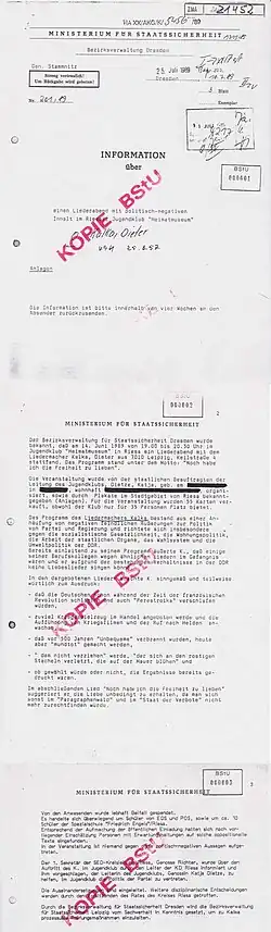- ↑ BSTU, 11. Juli 1984 – Bericht Abt. XX/Leipzig, Ref.7