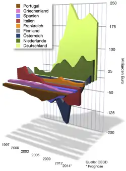 Viele keynesianische Ökonomen sehen in den im Euroraum bestehenden Leistungsbilanzdifferenzen eine Kernursache der Eurokrise, so etwa Heiner Flassbeck[16], Paul Krugman[17] und Joseph Stiglitz[18]. Als problematisch angesehen wird ein negativer Außenbeitrag v. a. dann, wenn gleichzeitig (wie in den USA) ein Haushaltsdefizit vorliegt; man spricht in einem solchen Fall von einem Doppeldefizit oder aus dem englischen wörtlich übersetzt Zwillingsdefizit (twin deficit). Die Vermögensveränderung setzt sich dabei wieder aus dem Leistungsbilanzsaldo, von dem der Außenbeitrag ein Teilsaldo ist, und dem Saldo der Vermögensübertragungen zusammen. Umgekehrt kann ein negativer Außenbeitrag aber auch positiv als Zufluss ausländischen Kapitals gedeutet werden, welches u. U. zu rentablen Investitionen eingesetzt wird.