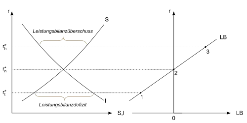 Wie bereits geschildert, führt die Verringerung des Weltzinssatzes zu einer Erhöhung der Investition. Das heißt, dass die Konsumenten einer Volkswirtschaft mehr Ressourcen verbrauchen. Wenn dieser Verbrauch über die aus der inländischen Produktion zur Verfügung stehenden Ressourcen steigt, kann dieser nur durch Importe aus der übrigen Welt gedeckt werden. Durch den erhöhten Ressourcenverbrauch steht nur noch ein geringerer Teil der inländischen Produktion für den Export zur Verfügung, die Exportmenge sinkt bei zunehmenden Importmengen, was zu einem Überschuss der Importe über die Exporte führt und damit die Leistungsbilanz tendenziell in ein Defizit führt. Umgekehrt lässt sich sagen, dass eine Erhöhung des Weltzinssatzes den Ressourcenverbrauch verringert, die Exportmengen steigen, die Importe zurückgehen und somit die Leistungsbilanz tendenziell einen Überschuss aufweist.