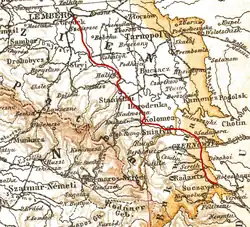 Am 15. Mai 1867 wurde der Gesellschaft die Konzession zum Bau und Betrieb der Lokomotiv-Eisenbahn von Czernowitz nach Suczawa erteilt[3]; diese Strecke wurde dann am 28. Oktober 1869 eröffnet.
