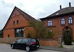 Um das Jahr 1900 wurde auf dem Anwesen der Mühle ein neues Wohnhaus errichtet.[13] Das gut erhaltene Gebäude wurde im Stil eines der damals auf reicheren Hofstellen erstellten Häuser in der für das ausgehende 19. Jahrhundert und das beginnende 20. Jahrhundert typischen Ziegelarchitektur besonders aufwendig errichtet.[14] Es ist ein zweigeschossiger symmetrisch gegliederter Ziegelbau unter Walmdach.[13] Der umlaufende Dachfries ist durch Ziegelsetzungen verziert.[14] Die Fassade ist durch Gesimse, Lisenen und gotische Zierelemente reich gegliedert.[13] Das Eingangsportal und die darüberliegenden Fenster sind in mit glasierten Ziegeln gestalteten spitzbogigen Gewänden gefasst.[14] Im Gebäudeinneren gibt es wertvolle Deckenmalereien.[13]