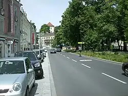 Straßenzug der Promenade Blickrichtung Landestheater, die ehemalige Nordflanke des Kastells