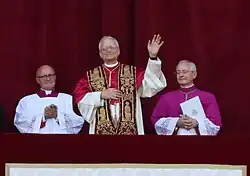 Am 8. Mai 2025 wurde Prevost am zweiten Tag des Konklaves – des ersten Konklaves, an dem er als Kardinal teilnahm – im vierten Wahlgang zum Papst gewählt. Er nahm den Papstnamen Leo XIV. an. Etwa eine Stunde nach der Wahl verkündete Kardinalprotodiakon Dominique Mamberti den neuen Papst der Öffentlichkeit auf der Benediktionsloggia des Petersdoms.[78] Leo XIV. erschien danach auf dem Balkon, um die auf dem Petersplatz versammelte Menge zu begrüßen, seine erste Ansprache zu halten und den nach einer Papstwahl üblichen Segen Urbi et orbi zu spenden.[79][80][81] Dabei trug er das Rochett, die päpstliche Sommermozzetta aus rotem Seidenkamelott und die Stola, die im Raum der Tränen bereitgelegen hatten.[82] Sein Vorgänger hatte seinerzeit sowohl das Rochett als auch die hermelinverbrämte Wintermozzetta aus rotem Samt abgelehnt[83] und die Stola der vier Evangelisten, die für Benedikt XV. angefertigt worden war,[1] erst zur Segenshandlung umgelegt.[84] Während Franziskus die Menschenmenge profan begrüßt hatte (Fratelli e sorelle, buona sera – „Brüder und Schwestern, guten Abend“),[85] rief Leo XIV. wieder das traditionelle und liturgische Pax vobiscum („Friede sei mit euch“), worauf die Gemeinde antwortet mit Et cum spiritu tuo („und mit Deinem Geiste“). Leo XIV. rief in seiner ersten Ansprache zum Brückenbauen und Frieden auf.[86] Darin steckt auch ein Vorsatz, bedeutet doch der päpstliche Titel Pontifex maximus „oberster Brückenbauer“. Zudem ist er seit seiner Wahl zum Papst von Amts wegen Präfekt des Dikasteriums für die Evangelisierung. Papst Franziskus hatte das Amt im Juni 2022 durch die Apostolische Konstitution Praedicate Evangelium auf den römischen Pontifex übertragen.[87]