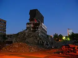 Die Bürohochhäuser der Leonberger Bausparkasse waren die ersten Hochhäuser in Leonberg und markierten den Beginn einer neuen Stadtmitte. Ihr Abriss im Mai 2009 (Sprengung am 31. Mai) bedeutete für die Stadt eine weitere städtebauliche Zäsur, da die historische Altstadt erstmals wieder aus größerer Entfernung sichtbar ist. Ein Architektenwettbewerb eröffnete Anfang 2008 die Perspektive, die historische Altstadt und die neue Stadtmitte mit Sichtachsen zu verbinden und zudem unterhalb der Altstadtkrone eine großzügige Freifläche für ein Reiterstadion zu reservieren.[26]
