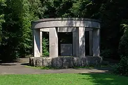 Am Blickpunkt einer langen Schneise wurde 1924 bis 1926 ein aus Muschelkalkstein bestehendes namenloses Denkmal für die gefallenen Offenbacher Soldaten aus dem Ersten Weltkrieg errichtet. Die Pläne stammten von Hugo Eberhardt, den bildhauerischen Schmuck schuf Ernst Edgar Unger. Die lange Bauzeit rührt aus erheblichen finanziellen Schwierigkeiten, die durch eine Sammlung am 1925 eingeführten Volkstrauertag beseitigt werden konnten. Errichtet in kreisrunder Form dienen rustizierte Quader als Sockel. An der nordöstlichen Seite findet sich eine sechsstufige Treppe, wodurch das Objekt begehbar wird. Acht Stützen tragen den Architrav mit scharriertem Rand. Im Inneren des Denkmals befindet sich ein glatter quadratischer Kubus mit Hessischen Wappenreliefen. Die einst auf dem Quader stehende Schale ist nicht mehr vorhanden.[1] Der pathetische Gestus des Denkmals löste bereits zur Eröffnung am Pfingstfeiertag 1926 heftige kritische Diskussionen aus.[4] Im Jahr 1957 wurde durch Hinzufügung der Jahreszahlen 1939–45 das Gedenken auf die Gefallenen des Zweiten Weltkrieges erweitert.[1]