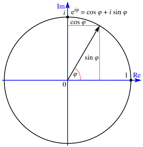 Euler verwendete erstmals die Exponentialfunktion und Logarithmen in analytischen Beweisen und definierte sie erfolgreich für komplexe Zahlen. Dadurch wurde deren Anwendungsbereich stark erweitert.[79] Damit fand er die enge Beziehung zu den trigonometrischen Funktionen. Für jede reelle Zahl (im Bogenmaß) besagt die Eulersche Formel, dass die komplexe Exponentialfunktion diese Gleichung erfüllt: