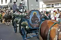 Die Bauern und Pferdebesitzer der jeweiligen Umgebung fahren dabei in Gespannen, sogenannten Truhenwagen, zum Wallfahrtsziel, beispielsweise in: