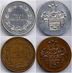 Schon zu Lebzeiten wurde zu seinen Ehren eine Medaille geprägt, welche 1824 das erste Mal in der Literatur[7] erwähnt wird. Diese Privatmedaille hat einen Durchmesser von 25 mm und ist in Silber[8] und Kupfer[9] ausgeführt worden. Die Vorderseite zeigt in einem Kranze von Eichenzweigen, welche durch ein Band zusammengehalten werden, in drei Zeilen die Wörter WELZL | DE | WELLENHEIM, auf der Rückseite ist das Welzl von Wellenheim’sche Wappen zu sehen.