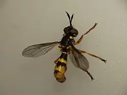 Die gelbschwarzen Fliegen sind 10–11 mm lang.[2] Der Vorderkopf ist gelb, die Frons schwarz. Am Hinterkopf befindet sich ein gelbbrauner Fleck. Der Thorax ist überwiegend schwarz gefärbt. An den Vorderwinkeln des Thorax befindet sich jeweils ein gelber Fleck. Das Scutellum ist gelb gefärbt.[2] Die Fühler sind schwarz. Die Fliegen besitzen einen unsklerotisierten gelben Proboscis.[2][3] Die Tergite 3 und 4 weisen am Vorderrand schwarze Bänder auf, die bei den Männchen eine, bei den Weibchen drei Ausbuchtungen nach hinten aufweisen.[2][3] Das schwarze Band am Vorderrand des zweiten Tergits besitzt nur eine einzelne Ausbuchtung nach hinten.[2] Die gelbe Legeröhre (Theka) der Weibchen ist verbreitert und hat in etwa die Breite des Hinterleibs bei Ventralansicht. Die seitlichen Ränder der Theka sind eingeschlagen.[2] Die Beine sind überwiegend gelb gefärbt. Lediglich die Femora weisen einen schwarzen Fleck auf.