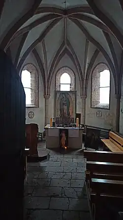 Das Kapelleninnere zeigt ein zweijochiges Langhaus mit einem Fünfachtelschluss unter einem spätgotischen Vierrautensterngewölbe auf Rundsäulen mit profilierten Kapitellen auf einem umlaufenden niedrigen Sockel. Der Chor hat ein spitzbogiges Achsfenster und zwei Seitenfenster mit kielbogiger Laibung, im zweiten nördlichen Langhausjoch gibt es ein querrechteckiges abgefastes Fenster. Der tonnengewölbte Keller ist nicht zugänglich.