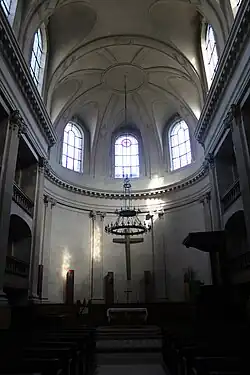 Die Kirche ist eine Emporenbasilika mit doppelten Emporen in klaren klassizistischen Formen. Die Ordnung der Säulen und Pilaster ist ionisch. Die Rundbogenfenster des Obergadens setzen sich in den fünf Fenstern der Rundapsis fort. Der Schaugiebel mit dem Portal weist zur Rue des Archives. Darüber steht ein laternenförmiger Dachreiter.