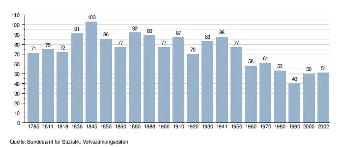 - ↑ Daten der Eidgenössischen Volkszählungen ab 1850 nach Gemeinden. (XLSX; 10 MB) Bundesamt für Statistik, Neuchâtel, 12. Juli 2024, abgerufen am 1. Juni 2025 (Öffnung in Excel nur über "Anhang/Excel-Datensatz" möglich).