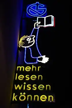 Das sogenannte „Lesemännchen“ mit dem Slogan „mehr lesen, wissen, können“, Leuchtreklame des Leipziger Kommissions- und Großbuchhandels an der Prager Straße (2017)