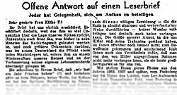 - ↑ Die Berliner Zeitung hatte anfangs keine Leserbrief-Sektion. Jedoch ging die Redaktion immer wieder auf Leserpost ein und zitierte sie. In diesem Beispiel beschwerte sich eine Leserin über die schlechte Versorgungslage in Berlin, ein Jahr nach Kriegsende. Die Redaktion antwortete sinngemäß, angesichts der Verwüstungen durch den Nationalsozialismus gäbe es andere Prioräten als Nähgarn.