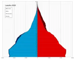 Lesotho hatte 2023 2,3 Millionen Einwohner.[9] Das jährliche Bevölkerungswachstum betrug + 1,1 %. Zum Bevölkerungswachstum trug ein Geburtenüberschuss (Geburtenziffer: 25,8 pro 1000 Einwohner[10] vs. Sterbeziffer: 14,1 pro 1000 Einwohner[11]) bei. Die Anzahl der Geburten pro Frau lag 2022 statistisch bei 3,0, die der Region Ost- und Süd-Afrika betrug 4,3.[12] Die Lebenserwartung der Einwohner Lesothos ab der Geburt lag 2022 bei 53 Jahren[13]. Der Median des Alters der Bevölkerung lag im Jahr 2021 bei 22,1 Jahren.[14] Im Jahr 2023 waren 33,8 Prozent der Bevölkerung unter 15 Jahre,[15] während der Anteil der über 64-Jährigen 4,2 Prozent der Bevölkerung betrug.[16]