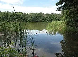 Das naturbelassene Gewässer ist vollständig von Wald umgeben. Die reich strukturierten Laubwälder des Naturparks Märkische Schweiz mit nach der Bundesartenschutzverordnung (BArtSchV) in Deutschland besonders geschützten Leberblümchen sowie Gelben Anemonen, Bachkraut, Wiesenprimel und Großblütigem Springkraut prägen Hainbuchen, Stiel- und Traubeneichen, Blutbuchen und Robinien. An den etwas feuchteren Standorten gedeihen Ulmen-, Ahorn- und Lindenarten sowie Rotbuchen. Eine besondere Rolle für die Ökologie spielen die reichen Totholzbestände.[12] Durch die Wälder streifen Rehe, Schwarzwild und Füchse sowie seit den 2000er-Jahren zunehmend auch Marderhunde und die Neozoen Waschbären und Minks.[13]