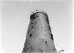 | Bauform: | rund, unten verkleidet, oben Stahlkonstruktion mit Helipad über der Laterne | |