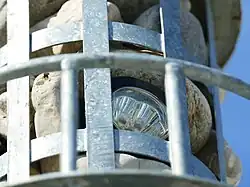 An der Spitze des Leuchtfeuers ist ein orangefarbener Windsack und ein solarbetriebenes LED-Licht befestigt, das in der Nacht leuchtet und das Leuchtfeuer markiert.