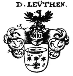 Das Geschlecht der Leuth nahm im 16. Jahrhundert in der Stadt Hachenburg im Westerwald viele Ehrenämter ein, wie Markt-, Kirchen- und Bürgermeister sowie Schultheiß.[1] Begütert waren sie auch in den angrenzenden Orten Geilenrod und Altstadt. So hatte Jost Leuth 1610 auf Grund eines Urteils der saynischen Räte Güter zu Geilenrod, Altstadt und vor der niederen Stadtpforte zu Hachenburg erhalten, die vorher Sophie Elisabeth geb. Leuth, Ehefrau des kurtrierischen Rats Christian Fischbach zu Koblenz, besessen hatte. Nach einem Prozess vor dem Reichskammergericht hatte die Vorbesitzerin ihre Güter 1612 aber wieder zurückbekommen.[3] Von Kaiser Ferdinand II. erhielten am 25. Mai 1629 zu Wien Claus (= Nicolaus) Leuth, gräflich saynischer Rat, Schultheiß, Schöffe und Freigutsbesitzer zu Hachenburg, und seine Söhne, Martin Leuth, hessischer Vizekanzler zu Darmstadt, und Adam Leuth, hessischer Rat zu Darmstadt, sowie für deren eheliche Nachkommen, einen Reichs-Adelsbrief.[4] Martin Leuth hatte als Vizekanzler dem 1617 in der Landgrafschaft Hessen-Darmstadt eingerichteten Geheimen Rat angehört, der zunächst nur aus dem wichtigsten Zentralbeamten, dem Kanzler, dem Hofmarschall, eben dem Darmstädter Vizekanzler und einem Hofrat bestanden hatte.[5]