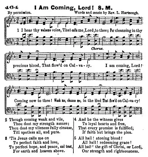 1871 zog Hartsough um zu einer Gemeinde in Epworth, Iowa.[4] Dort verfasste Hartsough für eine Massenevangelisation (revival meeting) den Gospelsong, für den er noch immer international bekannt ist. I Am Coming, Lord (“I hear thy welcome voice”) wurde im Revivalist veröffentlicht und erlangte internationale Bekanntheit, als Ira D. Sankey 1873 bei evangelistischen Veranstaltungen von Dwight Lyman Moody in Großbritannien das Lied in seiner walisischen Übersetzung „Gwahoddiad“ vortrug.[5]