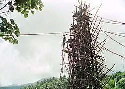 Mehrere Wochen vor dem Tag des eigentlichen Springens wird ein 15 bis maximal 30 Meter hoher Turm aus Holz errichtet. Rückgrat des Turmes bildet ein Baum, meist eine Kokospalme, die von allen Ästen bzw. Wedeln befreit wird. Die Äste des Turmes werden durch Lianen und weichgeklopfte Rindenstreifen miteinander verbunden. Zur besseren Stabilität des Bauwerks werden zusätzlich Lianen zu umliegenden Bäumen gespannt. Beim Bau des Turmes dürfen keine Frauen zusehen oder teilnehmen. Am Tag vor dem Sprung befestigen die Springer ihre Plattformen im Turm. Dabei ist es keinesfalls so, dass die jüngeren Männer ausschließlich von unten und die älteren Männer ausschließlich von oben springen. Eine festgelegte Reihenfolge gibt es hier nicht.