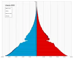 Liberia hatte 2023 5,4 Millionen Einwohner.[31] Das jährliche Bevölkerungswachstum betrug + 2,2 %. Zum Bevölkerungswachstum trug ein Geburtenüberschuss (Geburtenziffer: 31,0 pro 1000 Einwohner[32] vs. Sterbeziffer: 8,6 pro 1000 Einwohner[33]) bei. Die Anzahl der Geburten pro Frau lag 2022 statistisch bei 4,0, die der Region West- und Zentral-Afrika betrug 4,9.[34] Die Lebenserwartung der Einwohner Liberias ab der Geburt lag 2022 bei 61,1 Jahren[35]. Der Median des Alters der Bevölkerung lag im Jahr 2021 bei 17,9 Jahren.[36] Im Jahr 2023 waren 40,0 Prozent der Bevölkerung unter 15 Jahre,[37] während der Anteil der über 64-Jährigen 3,3 Prozent der Bevölkerung betrug.[38]
