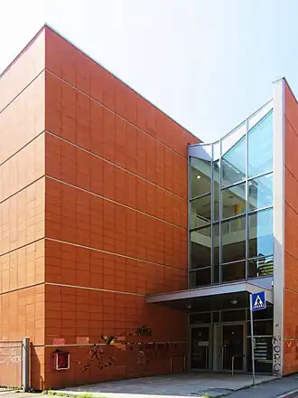 Das als Industriepavillon konzipierte, in einen großen Innenhof eingefügte und im brutalistischen Stil errichtete eingeschossige Gebäude gleicht in seinen äußeren Formen einer Kulturfabrik.[11]