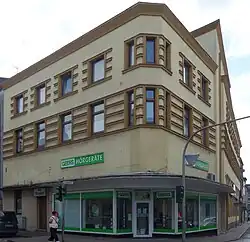 Das mit einem Flachdach versehene Eckgebäude hat ein turmartig überhöhtes Treppenhaus und durch Putzbänder zusammengefasste Fensterzonen.