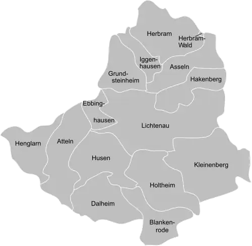 - ↑ Geographische Kommission für Westfalen (Hg.): Geographisch-Landeskundlicher Atlas von Westfalen, Themenbereich X Administration und Verwaltung, Doppelblatt staatliche und kommunale Verwaltungsgliederung. Münster 1990. Vgl. Gerhard Henkel: Geschichte und Geographie des Kreises Büren. Paderborn 1974, S. 101 f. und Kartenbeilage.