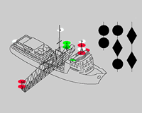 [27b] Drei Rundumlichter (rot – weiß – rot übereinander), wenn Fahrt durchs Wasser gemacht wird auch die üblichen Lichter (Seiten-, Heck- und Topplichter). Am Tag: Ein Ball über einem Rhombus, darunter ein Ball. Diese Signale können etwa gesetzt werden, wenn sich ein großes Schiff in engem Fahrwasser bewegt und es dadurch in seiner Navigationsfähigkeit und seiner Fähigkeit, den Ausweichregeln nachzukommen, beeinträchtigt ist. Andere Schiffe weichen aus. |