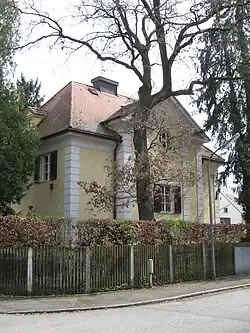 Der klassizisierende Walmdachbau, der zur Waldkolonie Pasing gehört, besitzt einen Giebelrisalit und eine breit durchfensterte Gartenfront.
