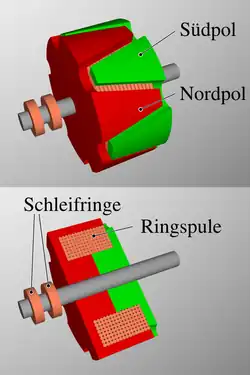 Hier wird der Erregerstrom über zwei glatte Schleifringe zugeführt, seine Höhe und damit die im feststehenden Stator induzierte Spannung wird geregelt. Der Erregerstrom ist erheblich kleiner als der Ausgangsstrom des Generators, was kleinere Abmessungen der nötigen Kohlebürsten erlaubt und in einer höheren Lebensdauer resultiert. Darüber hinaus ist gegenüber dem Kollektor eines Gleichstromgenerators ein höheres Drehzahlniveau möglich, weshalb schon bei Leerlaufdrehzahl des Antriebsmotors eine erhebliche elektrische Leistung zur Verfügung steht. Auch wird wesentlich weniger Bauraum als für eine Gleichstromlichtmaschine vergleichbarer Leistung benötigt.