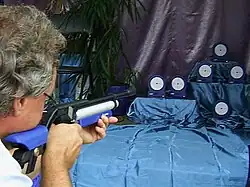 In der zweiten Variante ist die lichtausstrahlende Einheit, in der Regel ebenfalls mit einem ungefährlichen Lichtstrahl der Laserklasse 1, komplett fest in die äußere Form eines Gewehres/einer Pistole eingebaut. Das Ziel wird schon beim Visieren mit einem roten Punkt angezeigt. Die Zielgeräte geben bei einem Treffer ein Licht- und Tonsignal von sich. Die übliche Zielentfernung für diese Geräte liegt zwischen fünf und zehn Meter. Ausgestattet mit den für übliche Wettkampfwaffen verwendeten Visierungen kann völlig ungefährlich das Sportschießen trainiert werden.