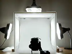 Das Lichtzelt ist eine Umbauung des Motives mit lichtdurchlässigem, streuendem Material, etwa in Zeltform, die von außen beleuchtet wird. Bedingt durch die jeweilige Bauform entsteht eine weiche, schattenarme bis schattenfreie, allerdings im Vergleich zur direkten Beleuchtung abgeschwächte Leuchtwirkung.