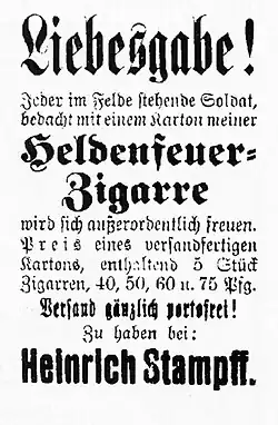 Die Geschäfte und Versandhäuser stellten ihre Reklame im Verlauf des Krieges schnell auf die neue Situation um. So wurden die bevorzugten Liebesgaben wie Tabak, alkoholische Getränke, Stärkungs- oder Körperpflegemittel mit zusätzlichen Werbesprüchen angepriesen. Da hieß es beispielsweise „unser Produkt ist unentbehrlich im Felde“ oder es hat schon „viel Anerkennungen auf dem Felde“ erhalten. Dazu wurden die Produkte oftmals gleich mit einer entsprechenden Feldpostverpackung angeboten.[17]